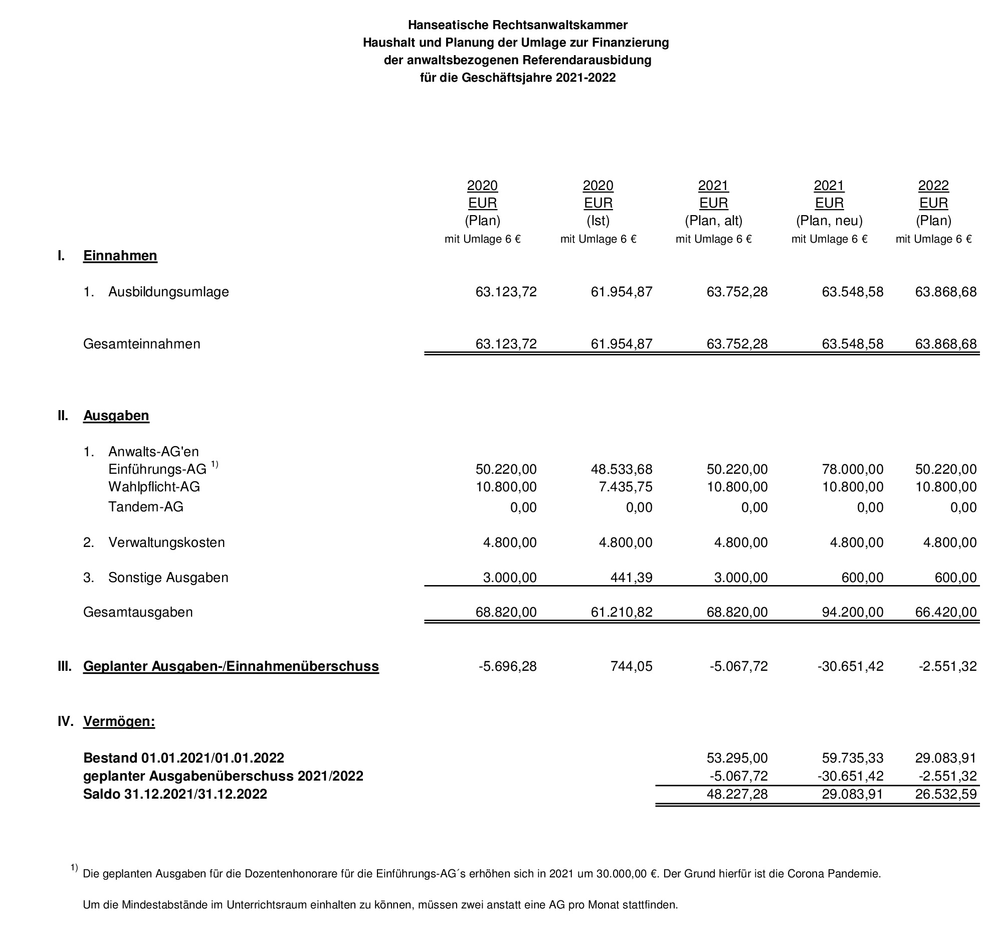 Anlage 8: Haushalt und Planung der Umlage zur Finanzierung der anwaltsbezogenen Referendarausbildung