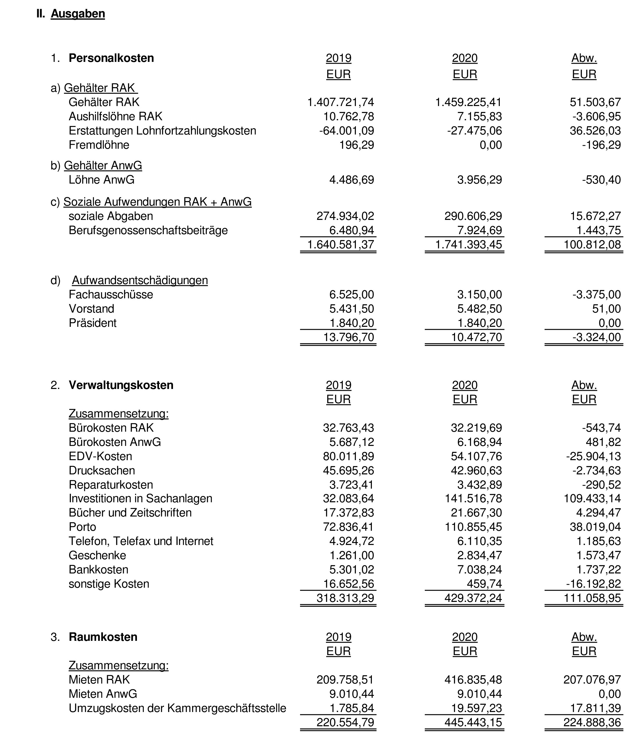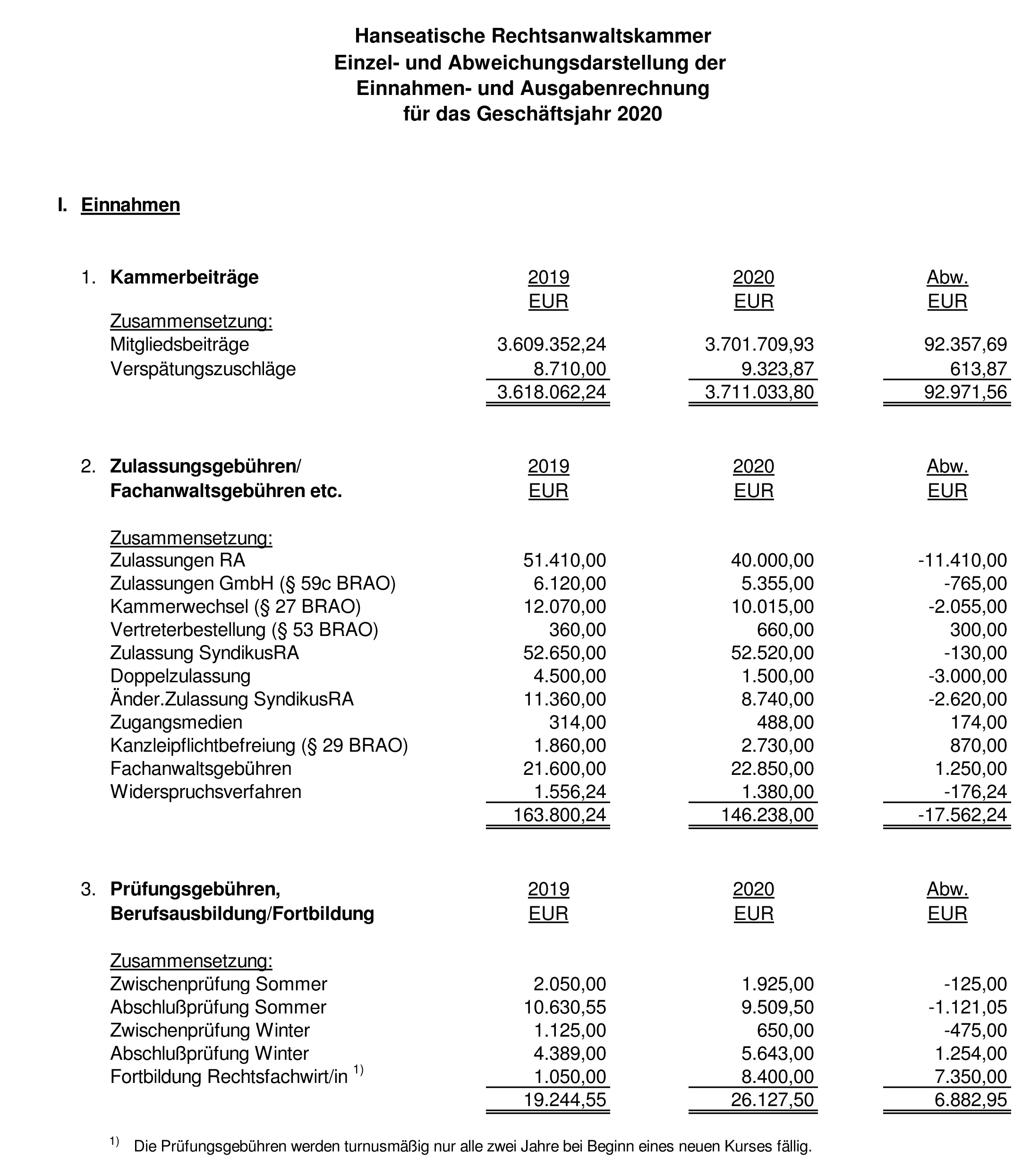 Anlage 2: Einzel- und Abweichungsdarstellung der Einnahmen- und Ausgabenrechnung für das Geschäftsjahr 2020