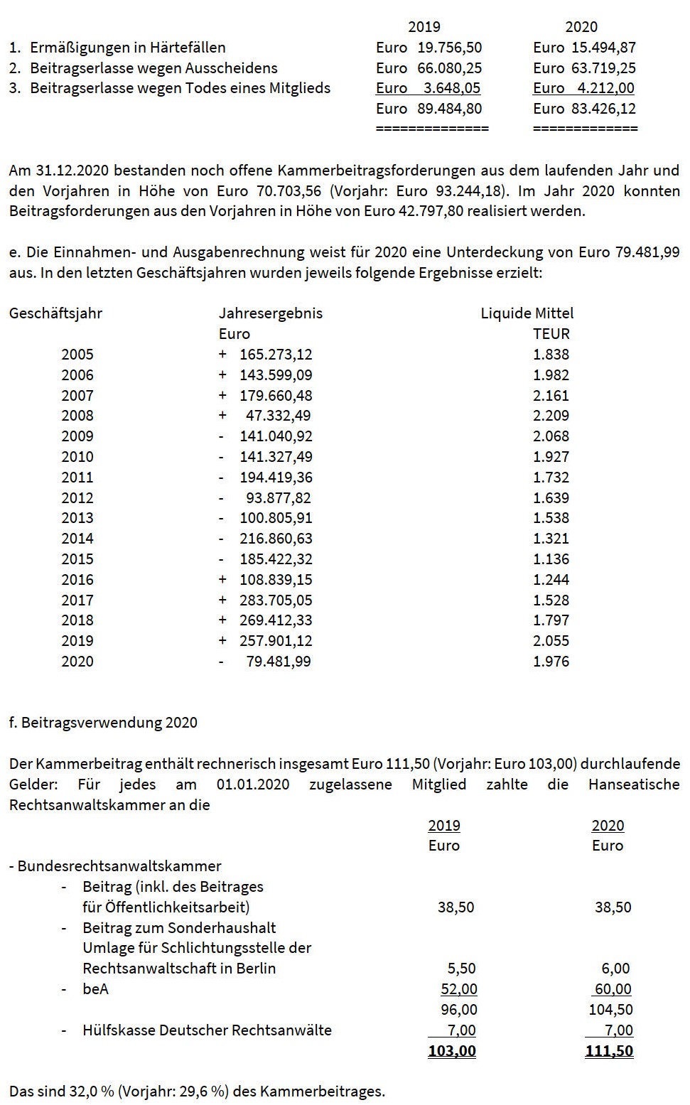 b. Die Hanseatische Rechtsanwaltskammer hat gemäß § 98 Abs. 2 BRAO die Kosten des Anwaltsgerichts zu tragen. Diese betrugen im Berichtsjahr 2020 insgesamt Euro 19.135,67 (Vorjahr: Euro 19.184,25), davon für Miete Euro 9.010,44 (Vorjahr: Euro 9.010,44) und allgemeine Bürokosten Euro 6.168,94 (Vorjahr: Euro 5.687,12).