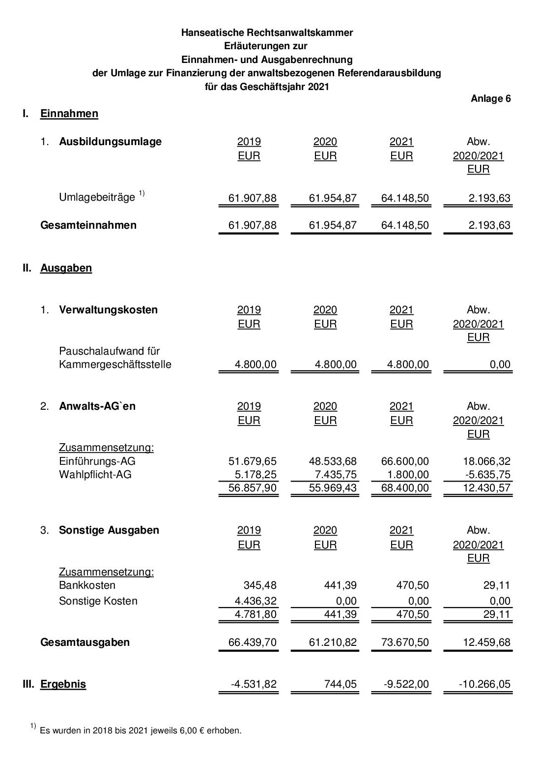 Anlage 6: Erläuterungen zur Einnahmen- und Ausgabenrechnung der Umlage zur Finanzierung der anwaltsbezogenen Referendarausbildung