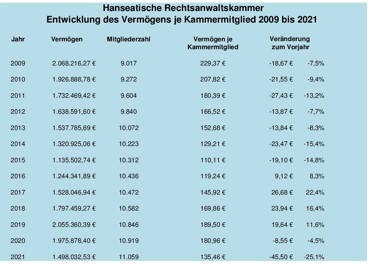 Der Kammerbeitrag enthält rechnerisch insgesamt Euro 109,50 (Vorjahr: Euro 111,50) durchlaufende Gelder: Für jedes am 1. Januar 2021 zugelassene Mitglied zahlte die Hanseatische Rechtsanwaltskammer an die