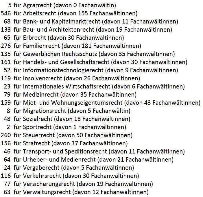 Insgesamt gab es am 31.12.2020 in Hamburg 2.342 (Vorjahr: 2.283) Fachanwälte, wobei 319 Rechtsanwälte und 72 Rechtsanwältinnen jeweils 2 Fachanwaltstitel und 24 Rechtsanwälte und keine Rechtsanwältin 3 Fachanwaltstitel führen. Im Einzelnen verteilen sich die Zahlen wie folgt auf die Fachgebiete: