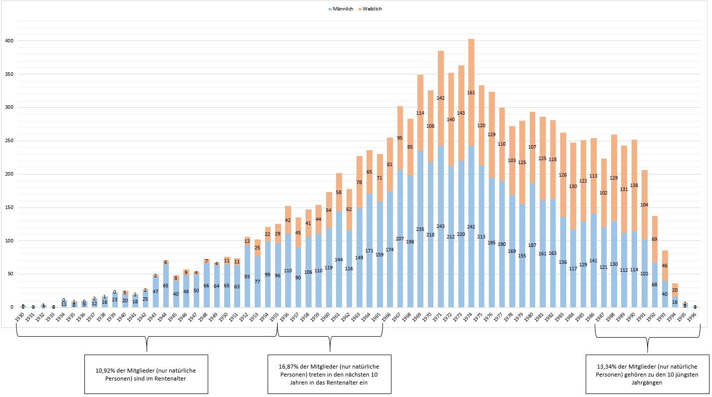 13,34% der Mitglieder gehören zu den 10 jüngsten Jahrgängen. 267 Mitglieder sind unter 30 Jahre alt.