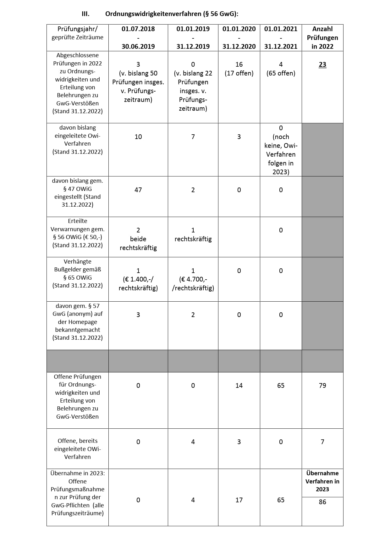 Seit dem 01.01.2020 ist die Hanseatische Rechtsanwaltskammer gemäß § 73 b Abs. 1 BRAO auch für die Verfolgung und Ahndung von Ordnungswidrigkeiten nach § 56 GwG zuständig, soweit diese von ihren Mitgliedern begangen werden. Das GwG enthält derzeit einen Katalog von 81 Ordnungswidrigkeitstatbeständen, die Verstöße gegen die Sorgfaltspflichten nach dem GwG sanktionieren. Im Berichtsjahr 2022 sind zuvor verhängte 3 Verwarngelder und 2 Bußgeldbescheide rechtskräftig geworden. Die Höhe der rechtskräftigen Bußgeldbescheide betrug jeweils 1.400,-€ und 4.700,-€. Diese Maßnahmen wurden im Berichtsjahr auf der Homepage gem. § 57 GwG bekannt gegeben.