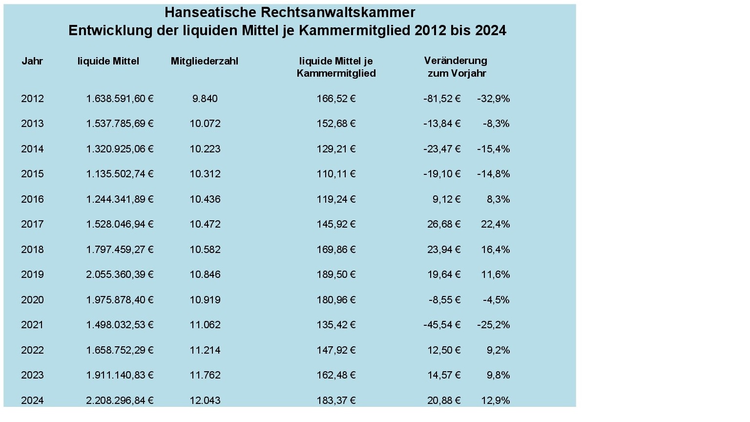 2. Die Hanseatische Rechtsanwaltskammer hat gemäß § 98 Abs. 2 BRAO die Kosten des Anwaltsgerichts zu tragen. Diese betrugen im Berichtsjahr 2024 insgesamt Euro 26.549,12 (Vorjahr: Euro 28.250,62), davon für Miete Euro 9.010,44 (Vorjahr: Euro 9.010,44) und allgemeine Bürokosten Euro 12.537,32 (Vorjahr: Euro 13.523,40).